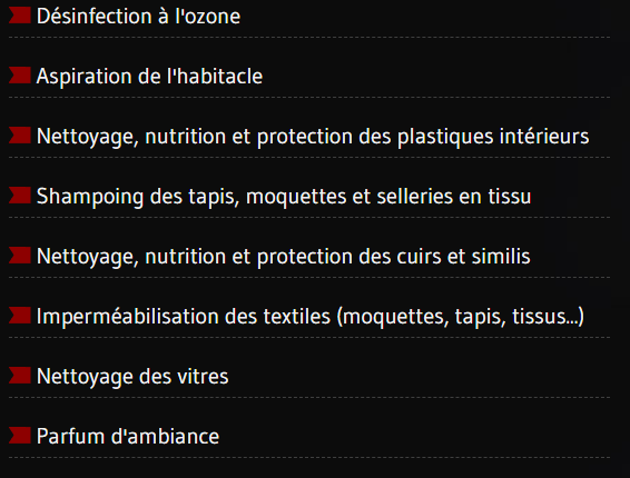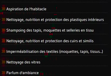 Je propose différentes formules adaptées à l’état de votre habitacle ainsi que des prestations à la carte : aspiration minutieuse, nettoyage des plastiques, shampoing des sièges et moquettes, entretien du cuir, désinfection, finitions détaillées…
